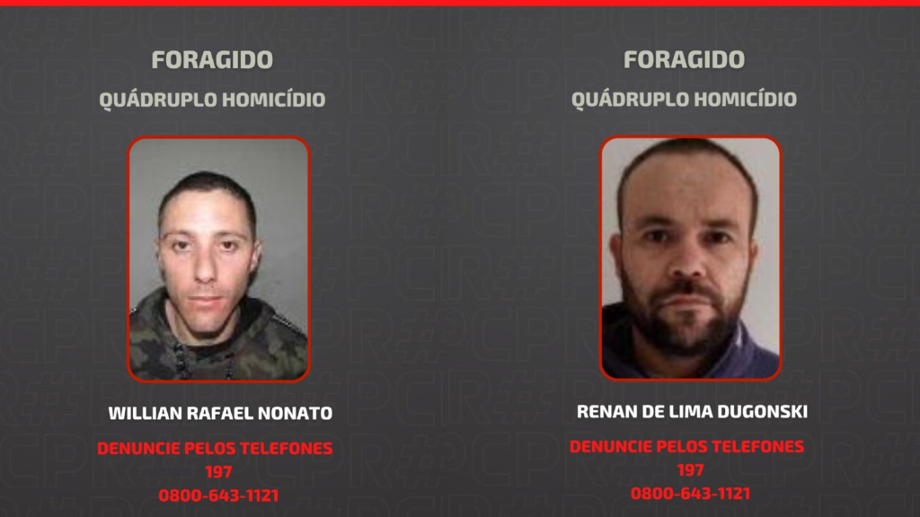 Os dois principais suspeitos de ambos os crimes foram identificados como Renan De Lima Dugonski, vulgo “Calça”, e Willian Rafael Nonato, conhecido como “Nenê”. Ambos estão com mandados de prisão expedidos pela Justiça e encontram-se foragidos. A Polícia Civil intensificou a busca por Dugonski e Nonato, considerados de alta periculosidade. Além deles, uma mulher que teria prestado apoio logístico no duplo assassinato, auxiliando na fuga dos suspeitos após o crime, foi presa preventivamente na quarta-feira, 7 de novembro. A Polícia Civil reforça a importância da colaboração da comunidade para localizar os foragidos. Informações sobre o paradeiro de Renan De Lima Dugonski e Willian Rafael Nonato podem ser repassadas de forma anônima e segura pelos telefones 0800-643-1121, 197 ou 181. A participação da população é crucial para que a justiça seja feita e para garantir a segurança pública.