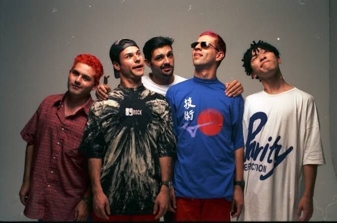 Banda Mamonas Assassinas. Da esquerda para a direita: Júlio Rasec, Dinho, Sérgio, Samuel e Bent...